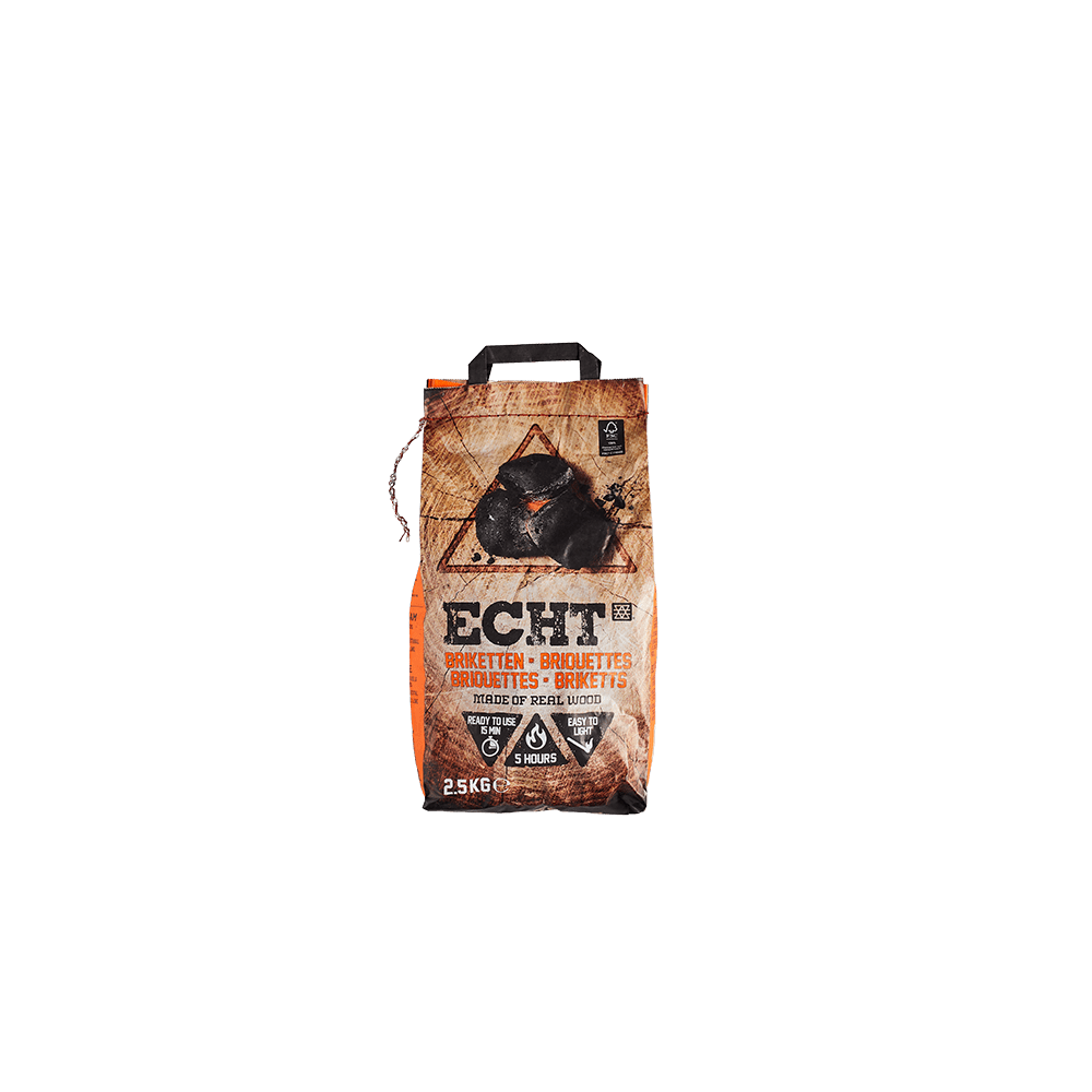 ECHT® briketten zijn gegarandeerd gemaakt van hoogwaardige houtskool van écht hout uit FSC® gecertificeerde bossen en geperst met een natuurlijk bindmiddel. Door het hoge gehalte aan zuivere koolstof, vrij van verontreinigingen, grill je het vlees beter en brandt de barbecue langer op een constante temperatuur.