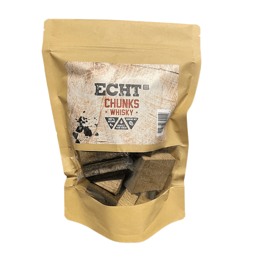 ECHT® Chunks in Whisky smaak. Een mooie jute zak met rond de 500-600 gram aan Chunks. Perfect voor het roken tijdens de bbq.