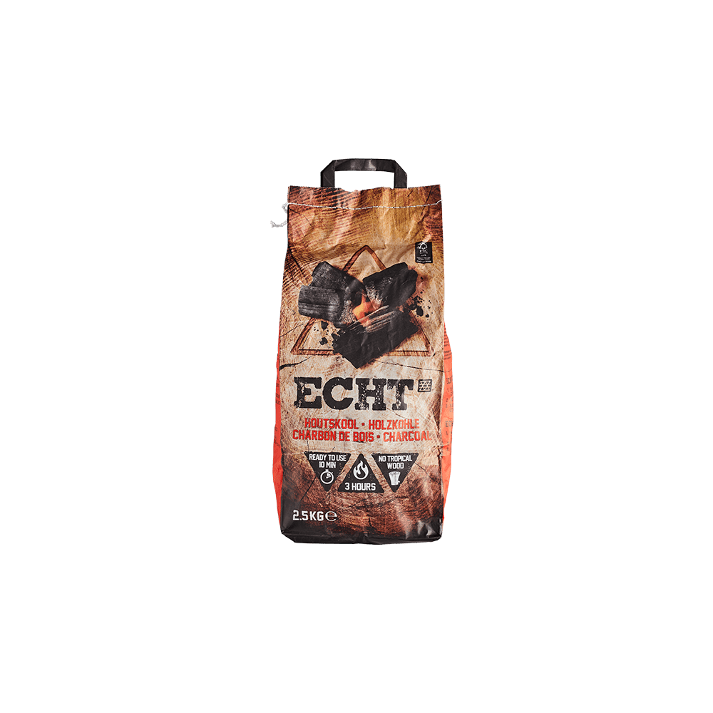 ECHT® Houtskool is gegarandeerd gemaakt van ècht hout uit FSC® gecertificeerde bossen. Door het hoge gehalte aan zuivere koolstof, vrij van verontreinigingen, grill je het vlees beter èn is de barbecue binnen 10 minuten heet. Voor een ECHT® lekkere BBQ en altijd het beste resultaat!