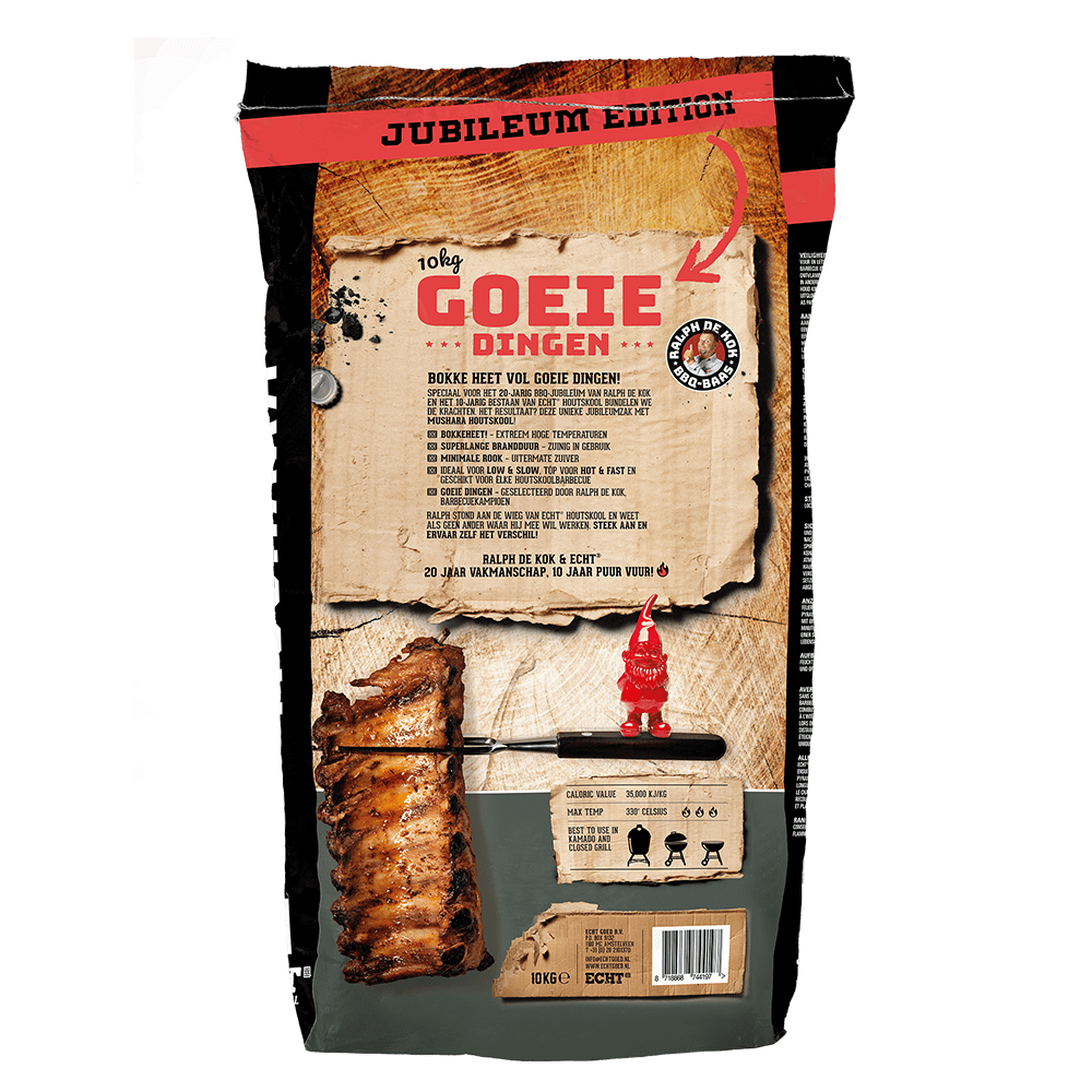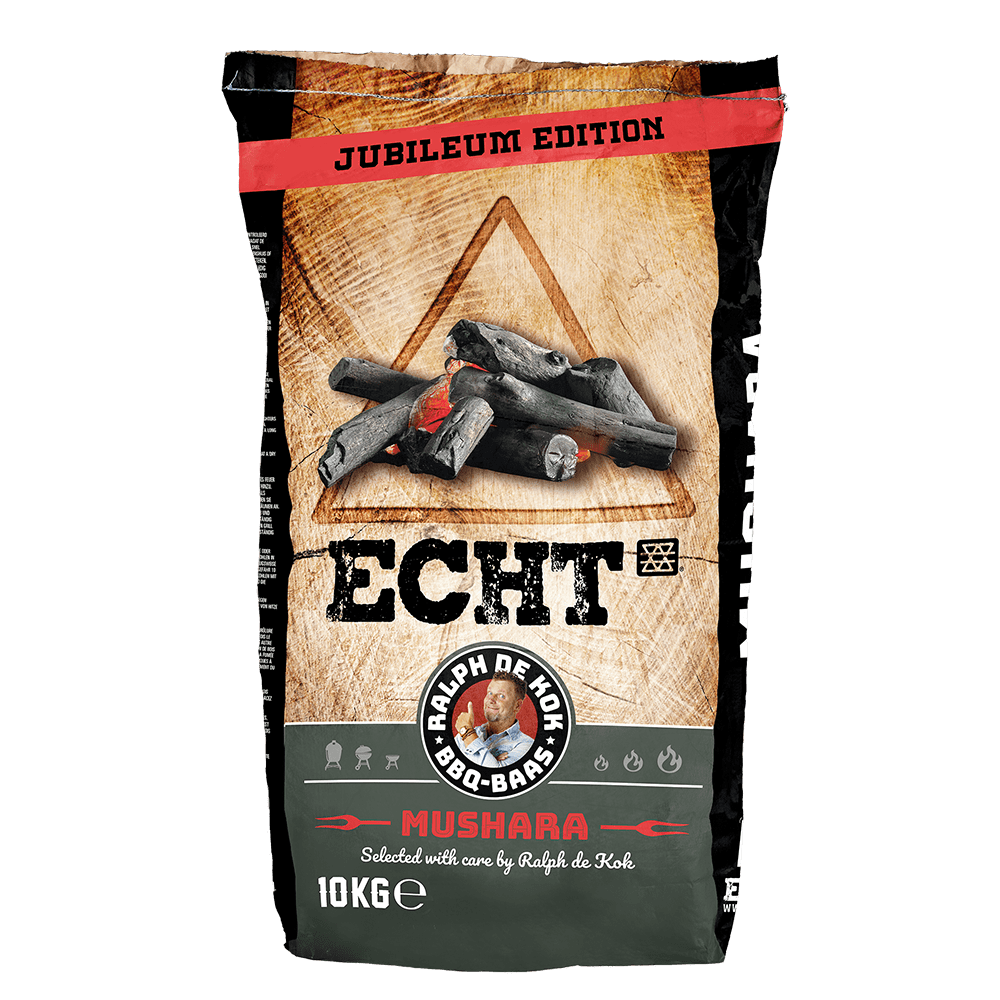 Wist je dat 10 jaar geleden BBQ Baas Ralph de Kok betrokken was bij het opzetten ons merk ECHT®? Toen was Ralph al 10 jaar actief in de BBQ scene en deelde met ons zijn ervaringen op het gebied van houtskool. We zijn inmiddels 10 jaar verder en samen vieren wij met Ralph ons jubileum! Ralph zit 20 jaar in het vak en wij 10! Dat vieren we met de Special Edition zak: ECHT Mushara.